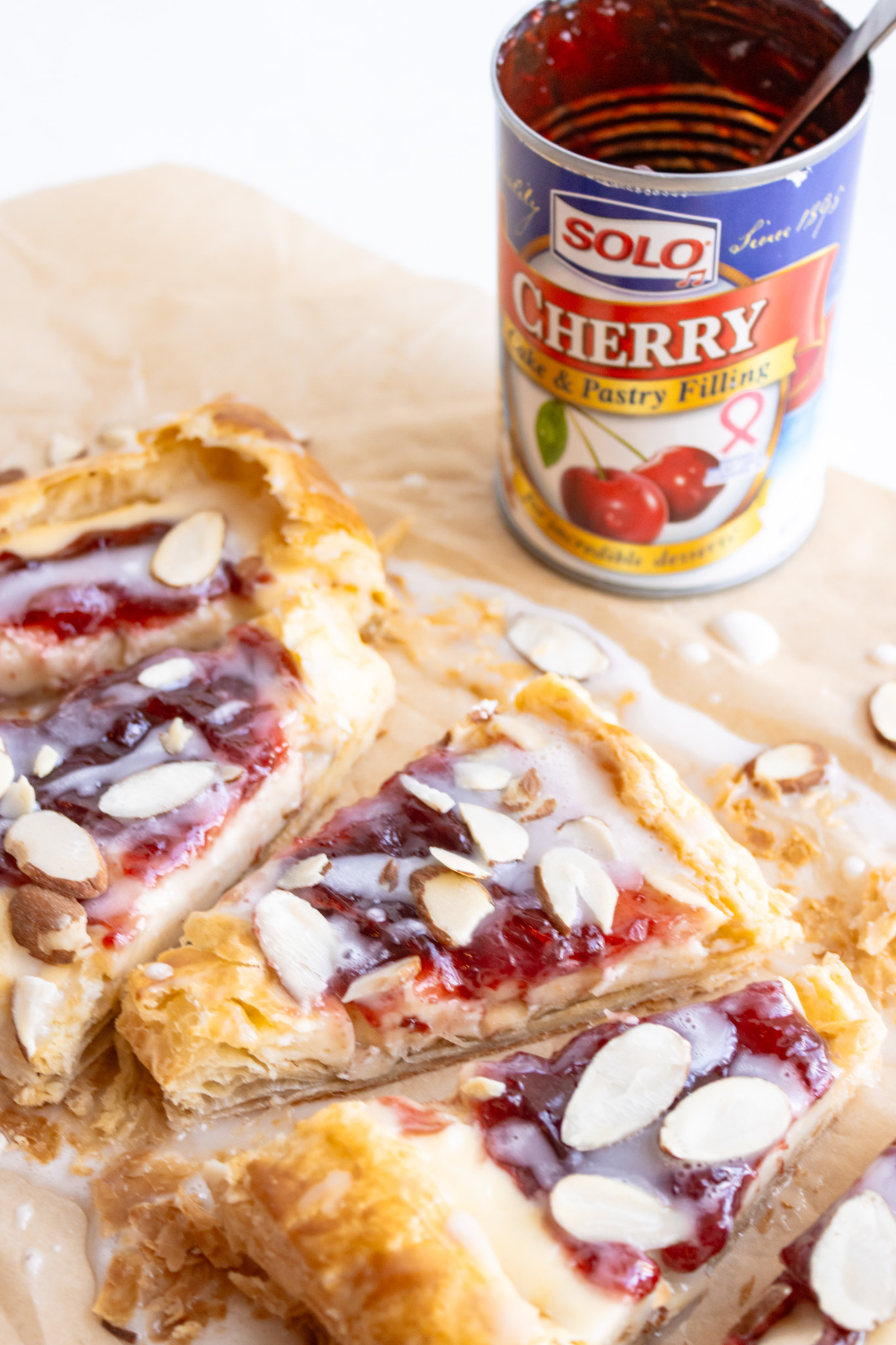 Preheat the oven to 400F. In a small mixing bowl, whisk egg, flour, sugar, salt, lemon juice, and almond extract together until smooth. Then, add cream cheese until smooth. On a sheet of parchment paper, roll out your puff pastry to flatten and smooth, Cut the puff pastry sheet into two rectangles. Transfer the paper onto a baking sheet and brush edges with milk and bake for 15 minutes. Take out of the oven and gently press down the center of the rectangles to create a middle indent for filling. Don't press hard or all the way to the bottom. Divide the cream cheese mixture between the two pastries and and spread evenly. Take about 4-5 spoonfuls of Solo Foods Cherry Cake and Pastry Filling and spread across the top of the cream cheese filling. Bake the pastries for 15 minutes, until the pastry is golden. Allow pastries to cool before adding the topping. Make the glaze by combining sugar, water, almond extract, and salt in a small bowl. Drizzle over pastries and top with almonds.