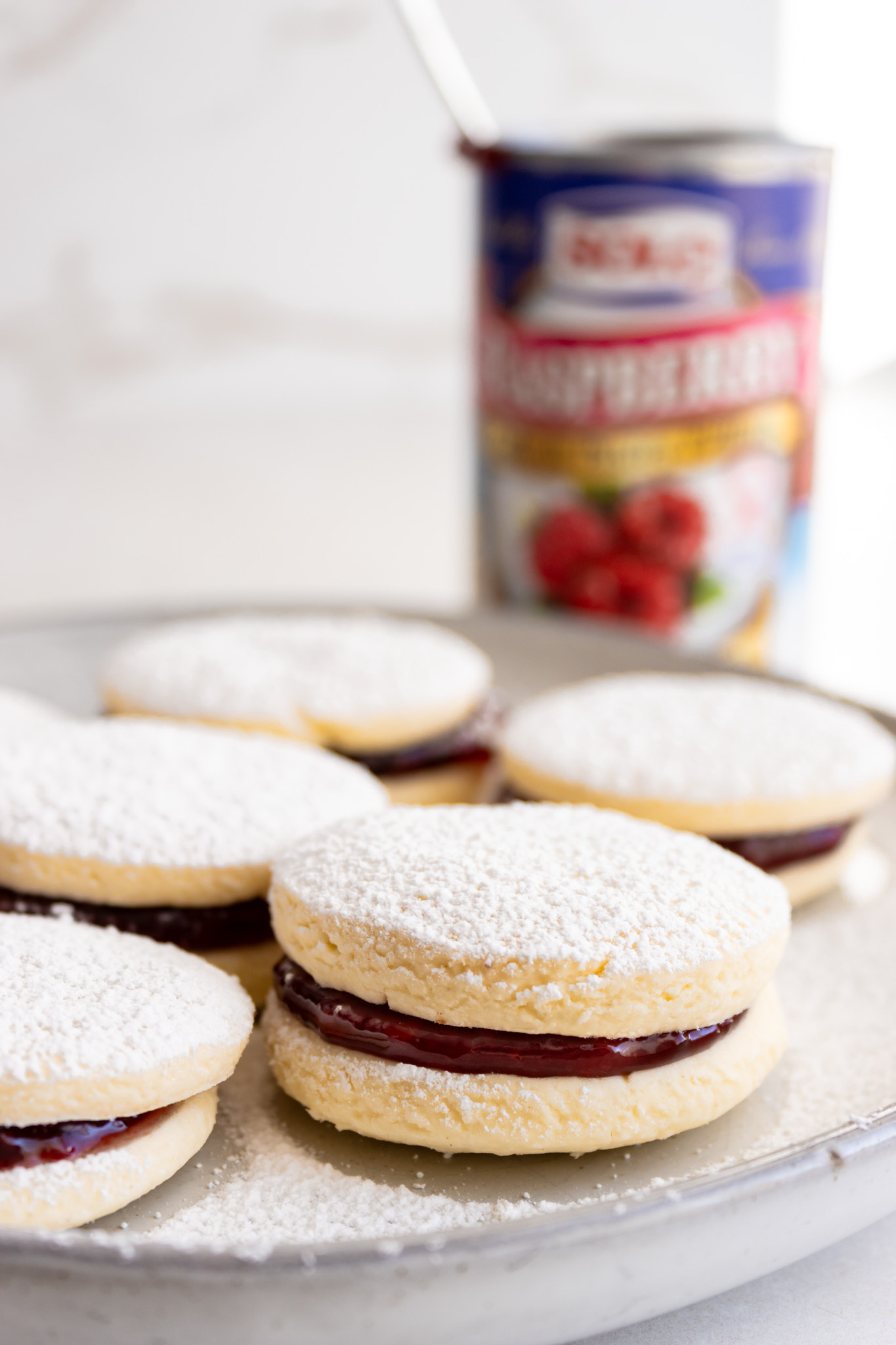 In a large pot over low heat, combine evaporated milk and sweetened condensed milk, stirring constantly until you can see the base of the pot. Transfer to a container and allow to cool prior to placing in a piping bag fitted with a small tip. Pipe a small ring of the manjar blanco on the outside of a cool cookie, filling the center with raspberry filling. Top with another cookie and dust with powdered sugar.