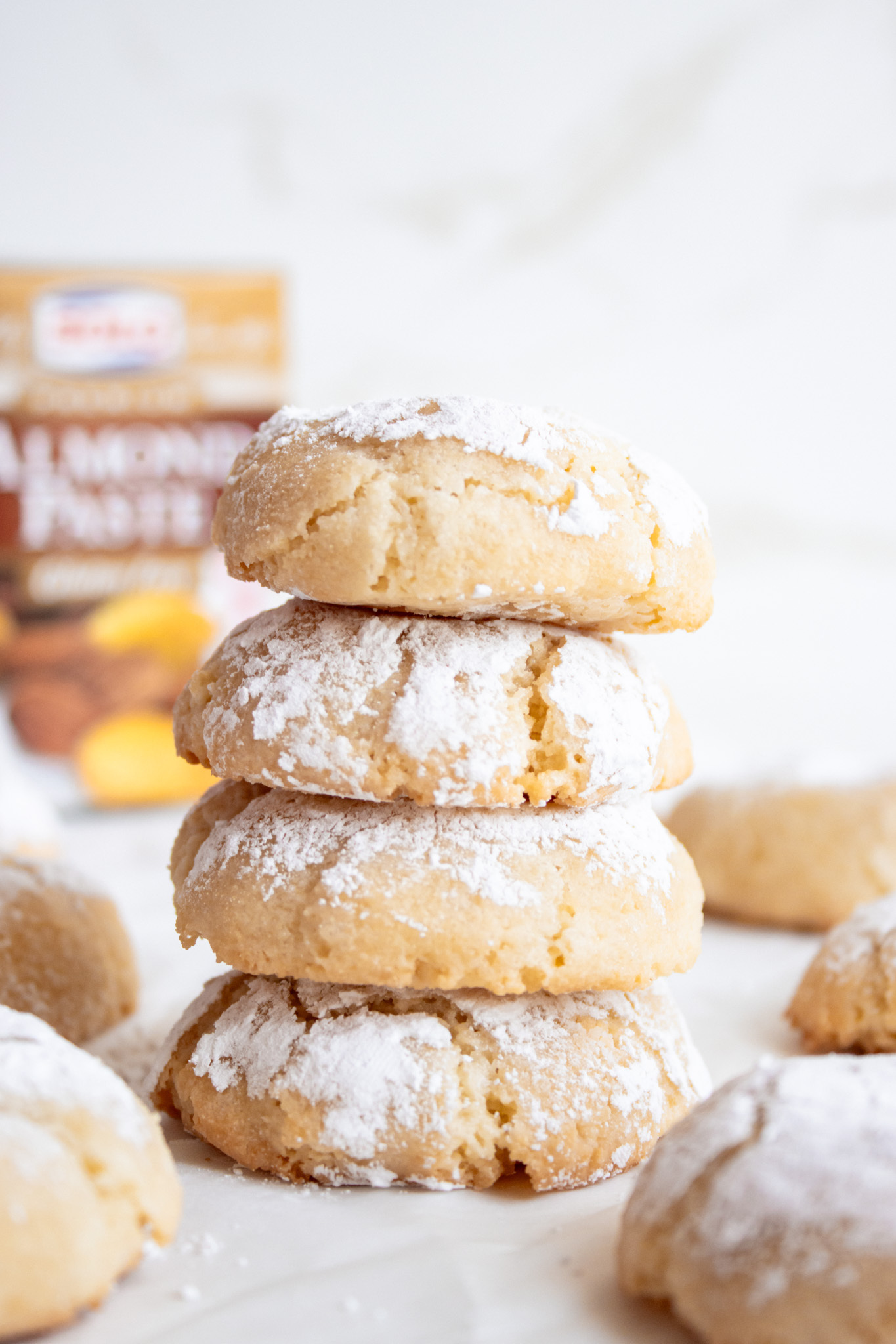To prep, preheat the oven to 375F and line two baking sheets with parchment paper. Break the almond paste into small pieces and place in a bowl with sugar. With an electric mixer, mix on low until it is very fine. Add the egg whites separately and mix well after each addition. Mix the dough for about 3 minutes or until smooth. Create balls of dough (about 1 tablespoon big) and place on baking sheet about 1 inch apart. Lightly press the top of the cookie to flatten it a bit and smooth top. Sprinkle a little sugar on top of each cookie. Bake for 15 minutes, or until the cookies have risen, are a deep golden color and have tiny cracks. Remove from the oven and let cool.
